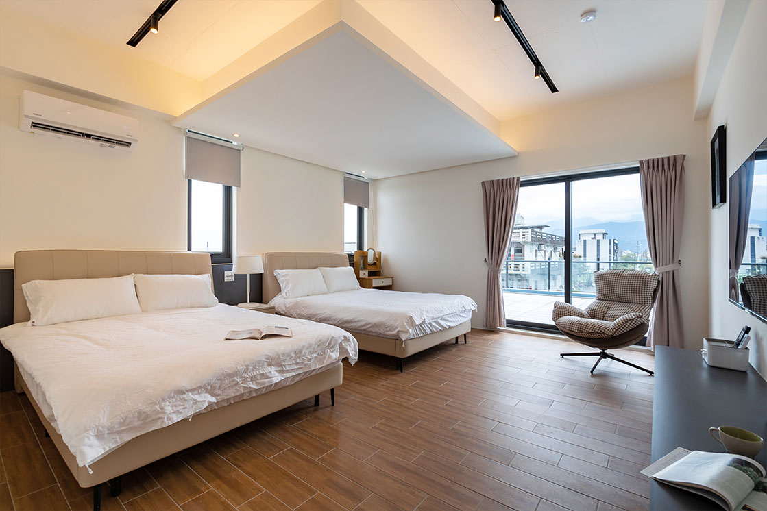 穗這裡提供六人房採四加二格局,連通陽台直面晨霧;二至四人房獨享大露臺,伸手即可觸摸蘭陽微風。純粹簡約的空間,為您框住每一刻最美的田園風景。