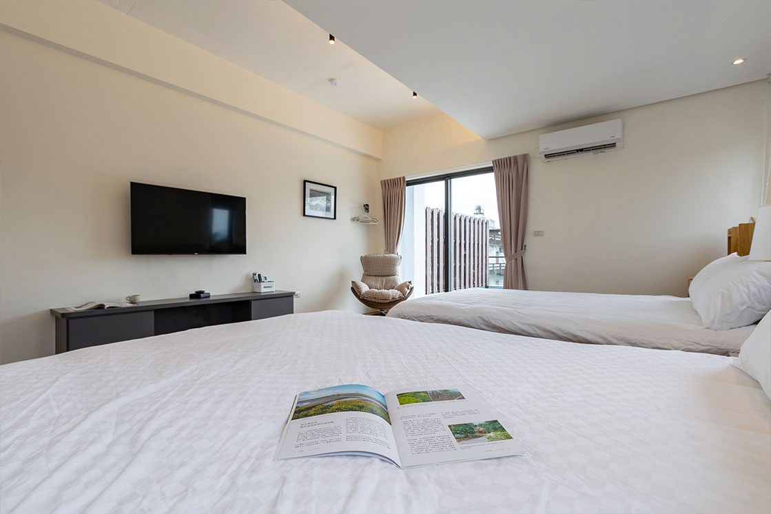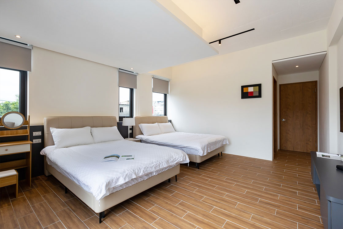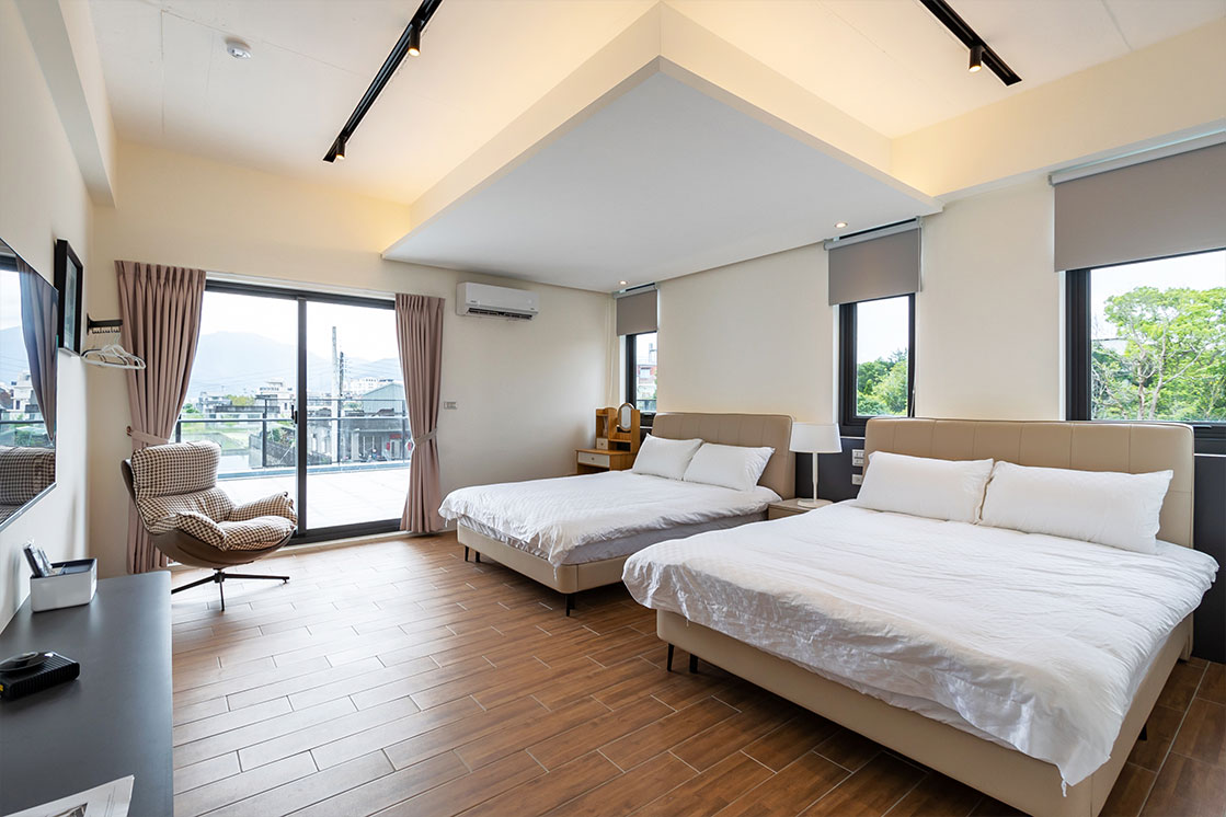 穗這裡提供六人房採四加二格局,連通陽台直面晨霧;二至四人房獨享大露臺,伸手即可觸摸蘭陽微風。純粹簡約的空間,為您框住每一刻最美的田園風景。